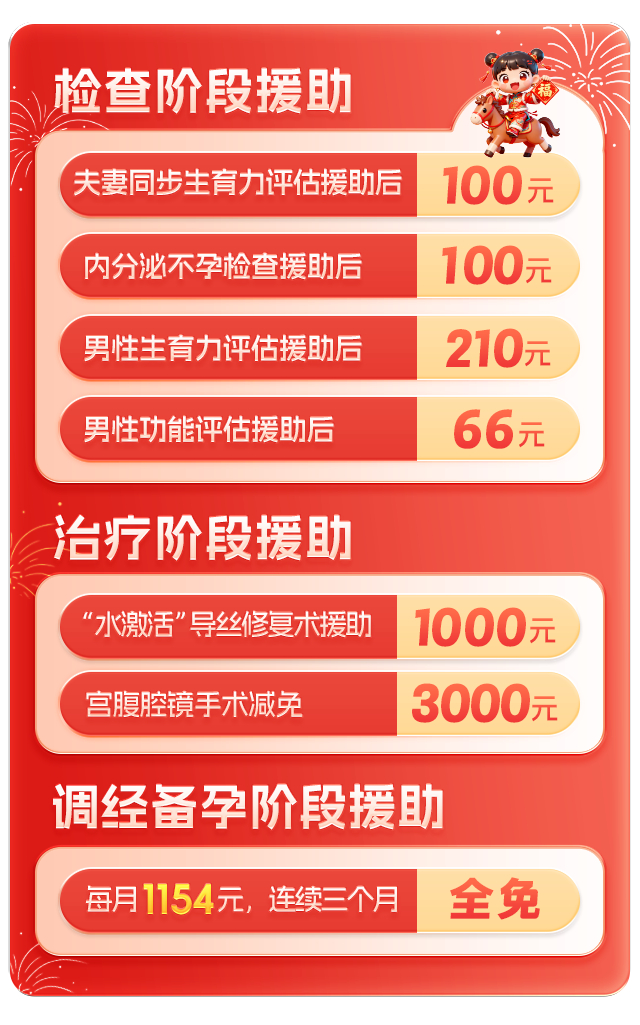 为切实减轻不孕不育家庭的就医负担,送子公益基金升级援助体系,特推出“一站式生育补贴:检查、会诊、治疗、助孕”全周期服务。这一创新模式打破了传统就医流程,实现“一次申请,全程补贴”的高效衔接。送子公益基金全程陪伴,全力护航,助您早日圆生育梦想。